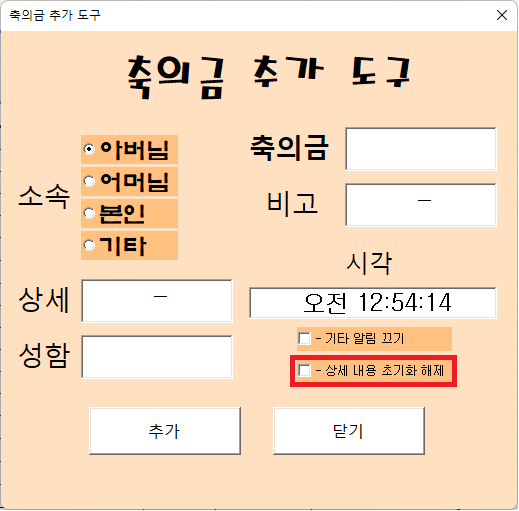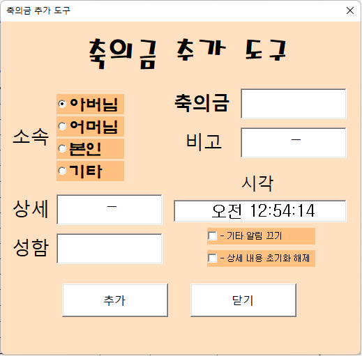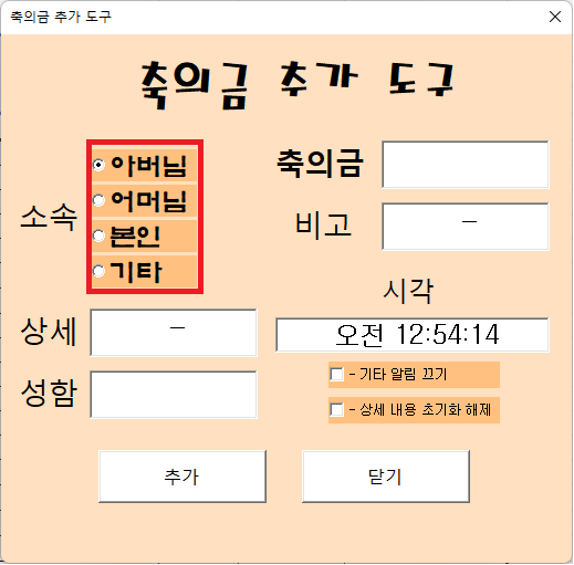 왼쪽의 축의금 추가 버튼을 클릭하시면 다음과 같은 폼이 나타납니다.
